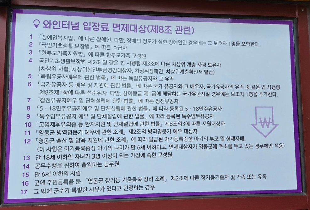 와인터널 입장료 면제되시는 분들도 자세히 안내가 되어 있었습니다. 해당되시는 분들은 증명서 가지고 가셔서 무료 입장하시면 좋을 것 같습니다.
