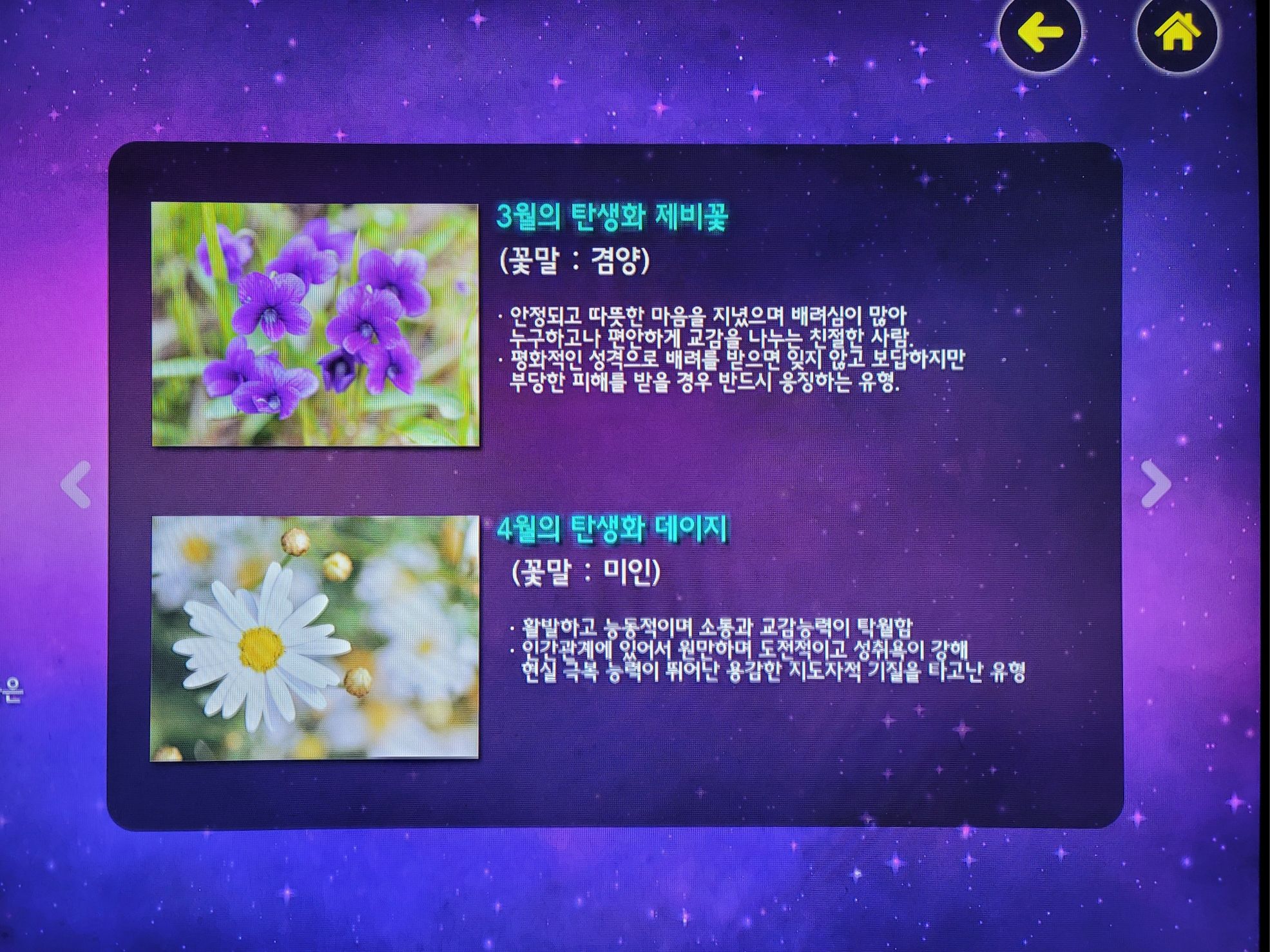 별자리 탐색도 할 수 있었는데요. 탄생석과 탄생화, 별자리에 따른 포도 품종까지 알 수 있어 흥미로웠습니다.