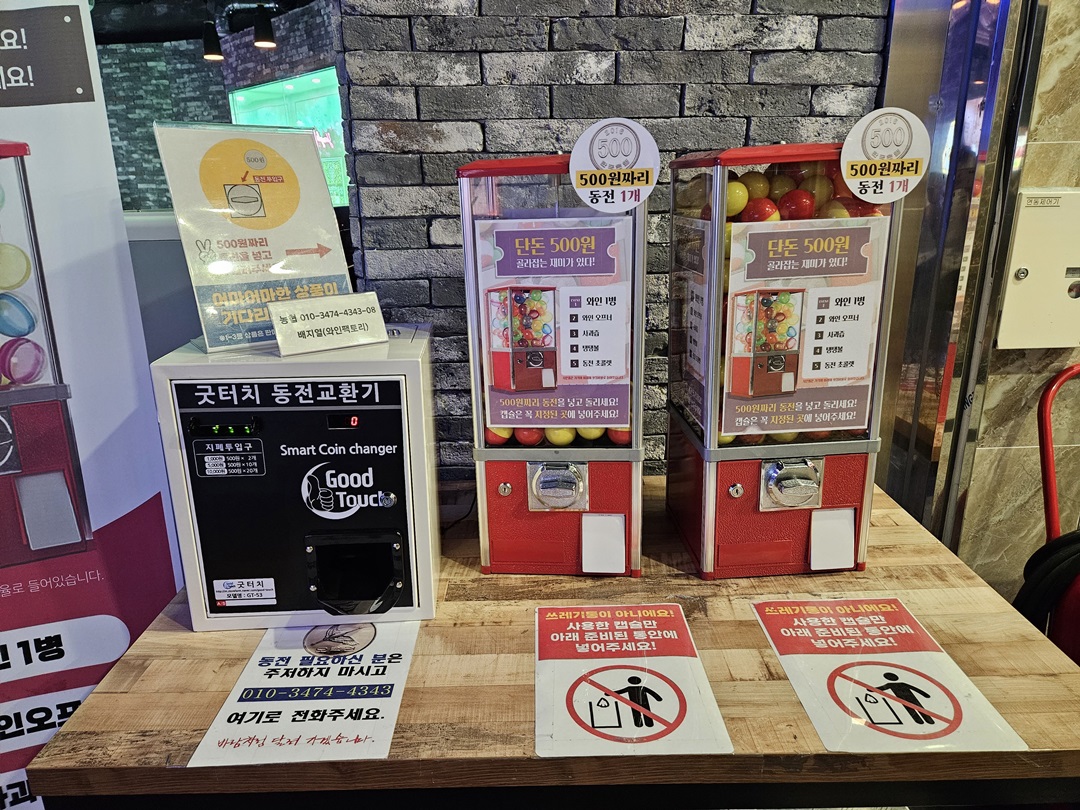 레스토랑 앞에 재미있는 자판기도 있었는데요. 500원짜리 동전 1개 넣고 레버를 돌리면 뽑기나 나옵니다. 그 속에 쪽지에 있는 상품을 받게 되는데요. 상품이 와인에서 동전초콜릿까지 한 번 돌려보고 싶은 마음이 정말 들었네요. 하지만 패스~~
