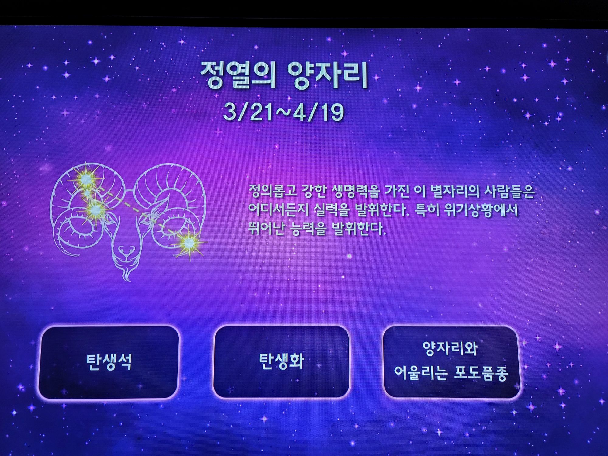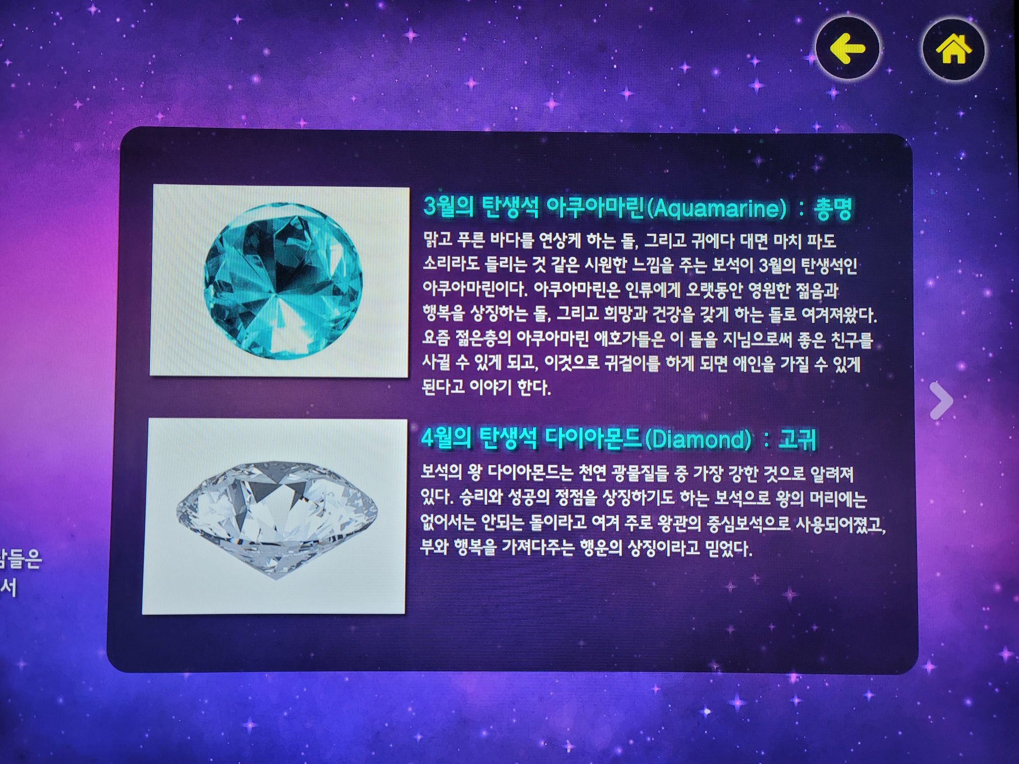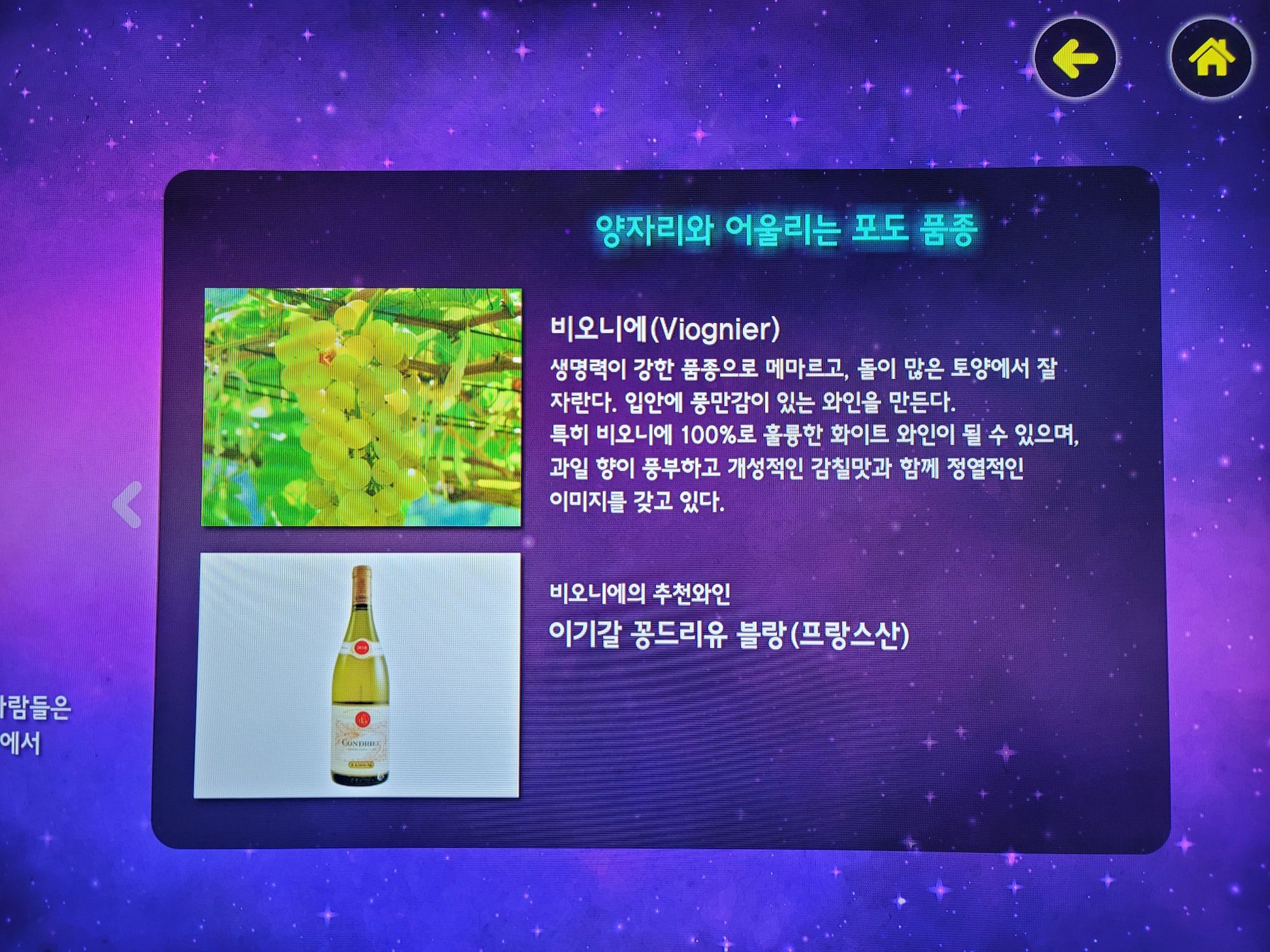별자리 탐색도 할 수 있었는데요. 탄생석과 탄생화, 별자리에 따른 포도 품종까지 알 수 있어 흥미로웠습니다.