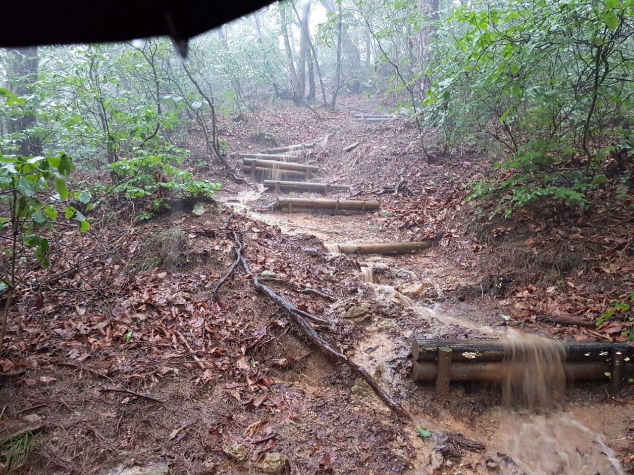 갑자기 소나기가 쏟아져 등산로가 순간 폭포로 변신했네요.