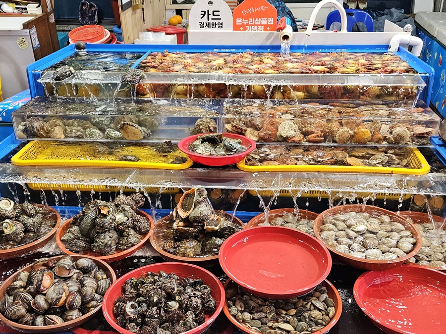 호스? 관? 에서 나오는 바닷물로 해산물들이 싱싱하게 오래 보관될 수 있는 것 같습니다. 가리비가 참 싱싱해 보이네요~