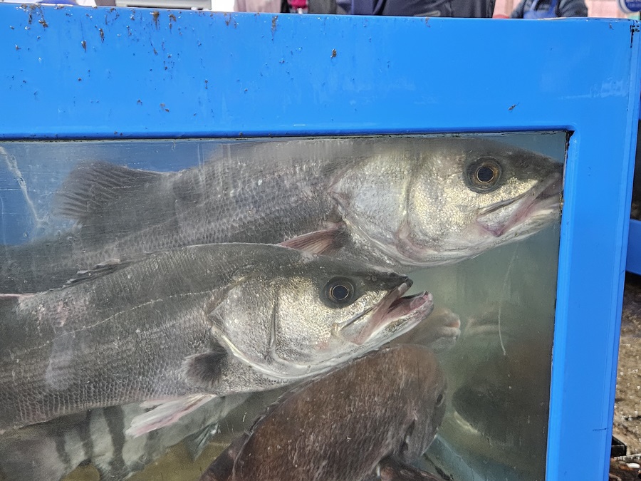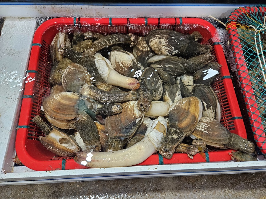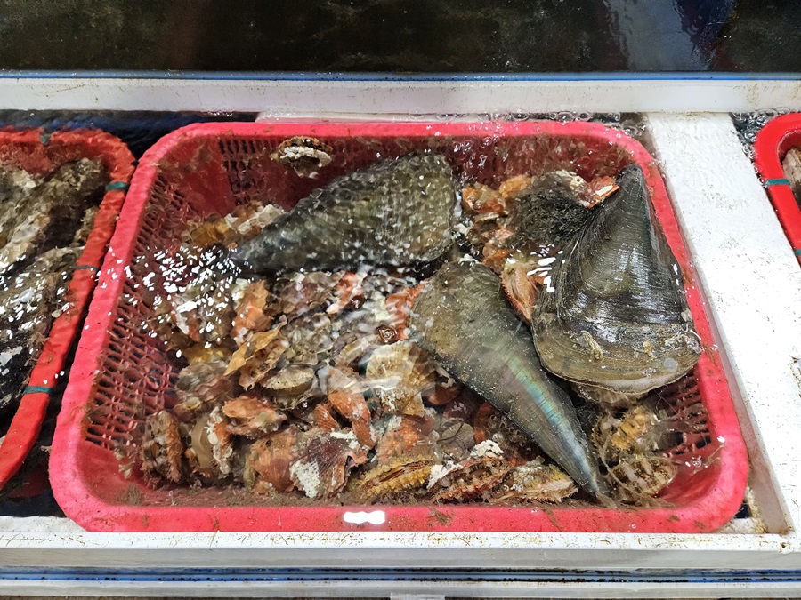조개류와 해삼도 수조에 가득 들어있습니다. 없는 게 없는 듯~