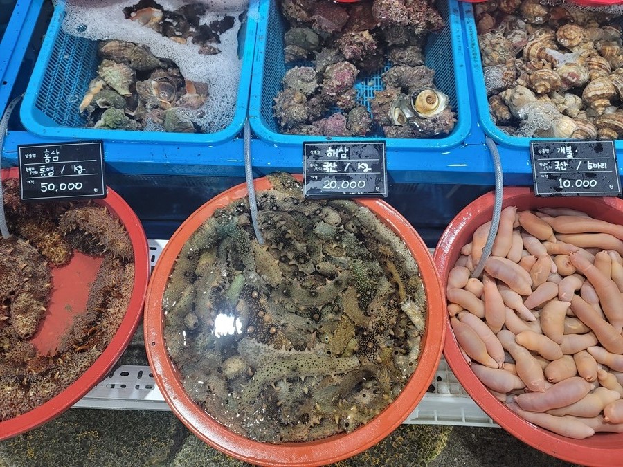 살짝 징그럽기도 하지만 손질해서 초장에 찍어먹으면 꼬들꼬들 맛있는 해삼과 개불, 그리고 육지에 있는 홍삼처럼 비싼 홍삼도 보이네요.