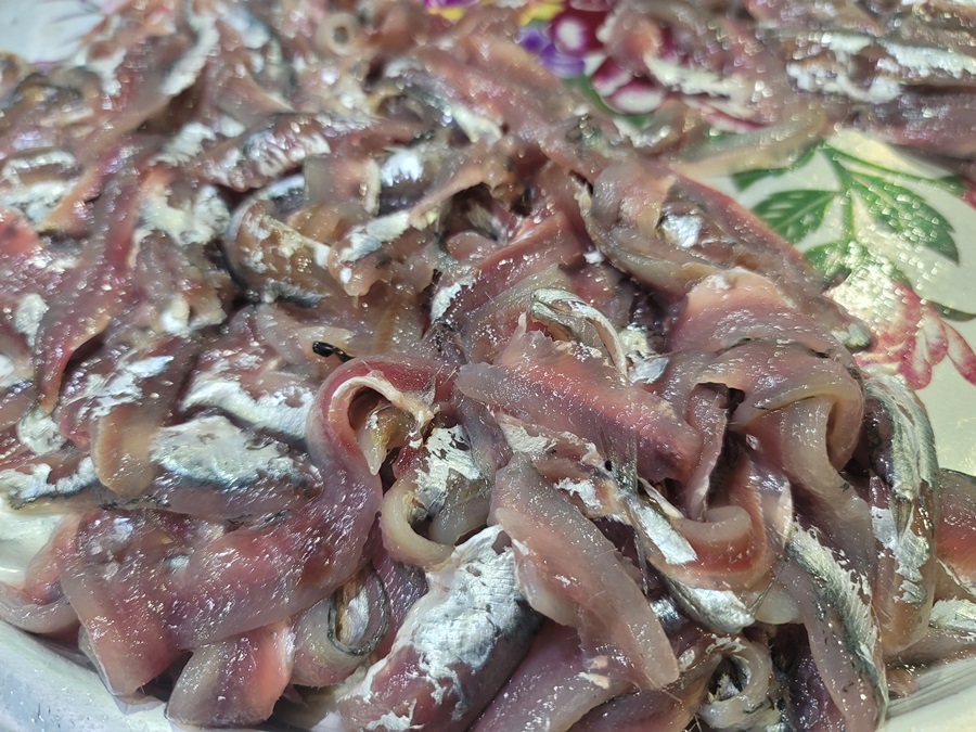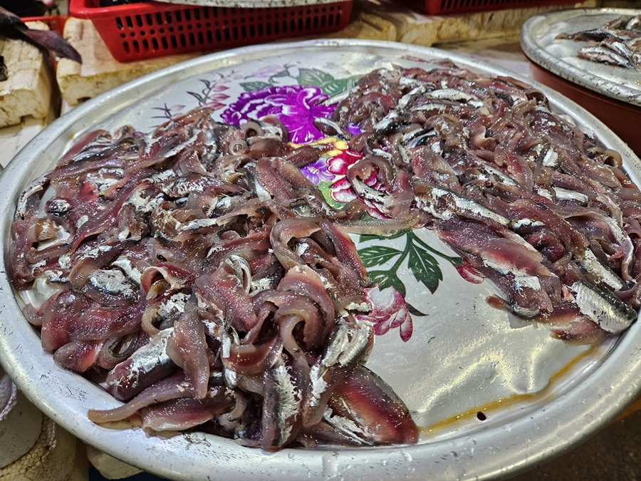 통영의 상징이 멸치이기도 하죠? 마른 멸치만 있는 것이 아니라 이렇게 회로도 판매를 하고 계셨습니다. 그냥 초장 찍어 먹어도 맛있지만 채소 넣고 초무침하거나 멸치조림해서 쌈밥으로 먹으면 정말 맛있습니다.