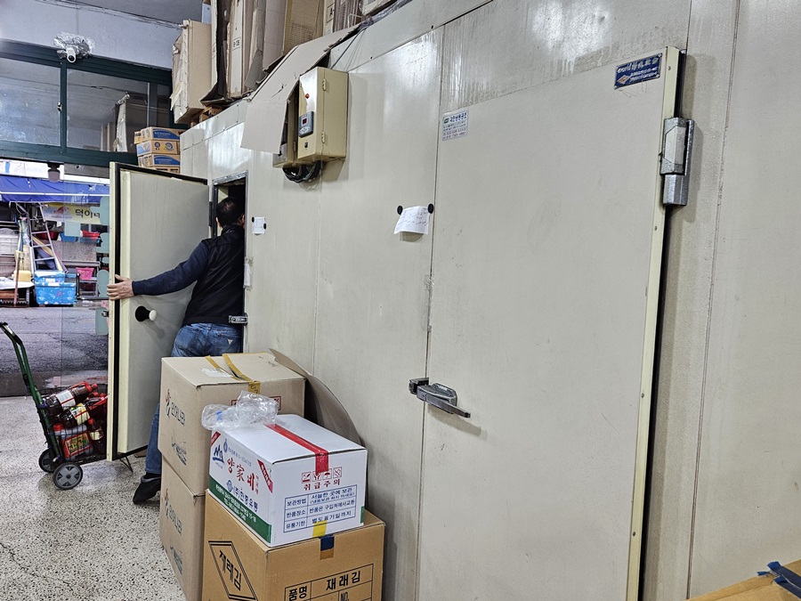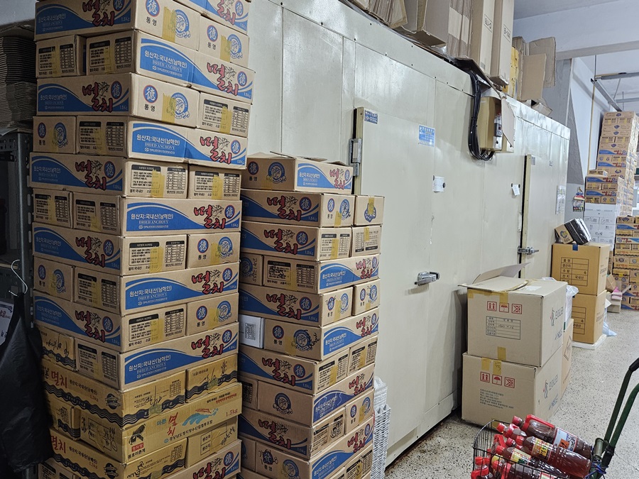 쌓여있는 멸치박스에는 아무것도 들어있지 않습니다. 멸치는 옆으로 보이는 냉장고에 보관되어 있답니다 그래서 더 품질 좋은 멸치를 구입할 수 있답니다.