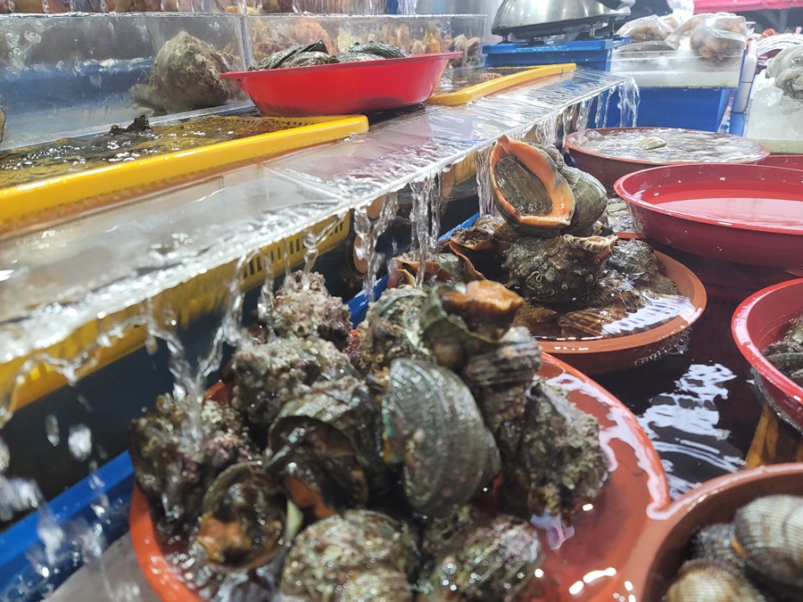 살아있는 전복도 많이 볼 수 있었는데요. 탈출하는 친구들도 종종 보였답니다. 부지런히 움직여야 바다에 도착할 텐데 말이죠~
