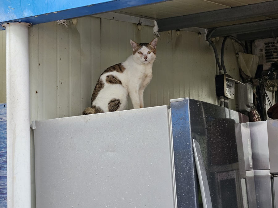 지나는 길에 있는 냉장고 위 고양이 한 마리~시장에 있는 것 치고는 살찌지 않은 걸 보니 마구 얻어먹는 거 같지는 않아 보였습니다. 먹거리 풍부한 서호시장을 잘 선택한 똑똑한 고양이입니다. 주인이 있을지도??