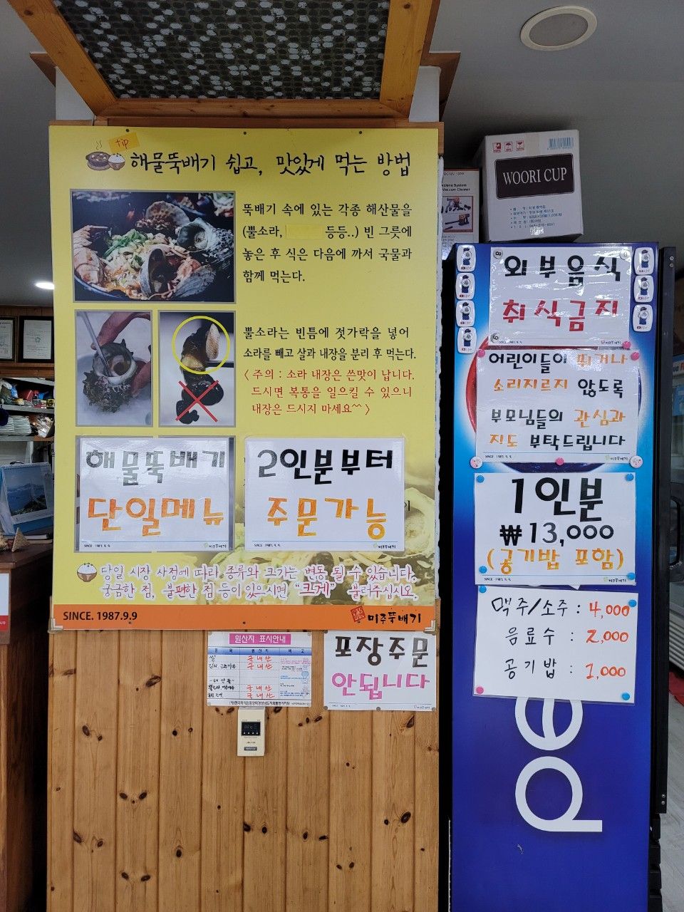 통영항 여객선 터미널 인근에 있는 해물뚝배기 전문점인 미주뚝배기 다녀왔습니다. 소라와 새우 등 다양한 해산물과 조개류 등을 가득 넣어 뚝배기에 팔팔 끊여서 내는 음식으로 현지인이 추천하는 맛집입니다.