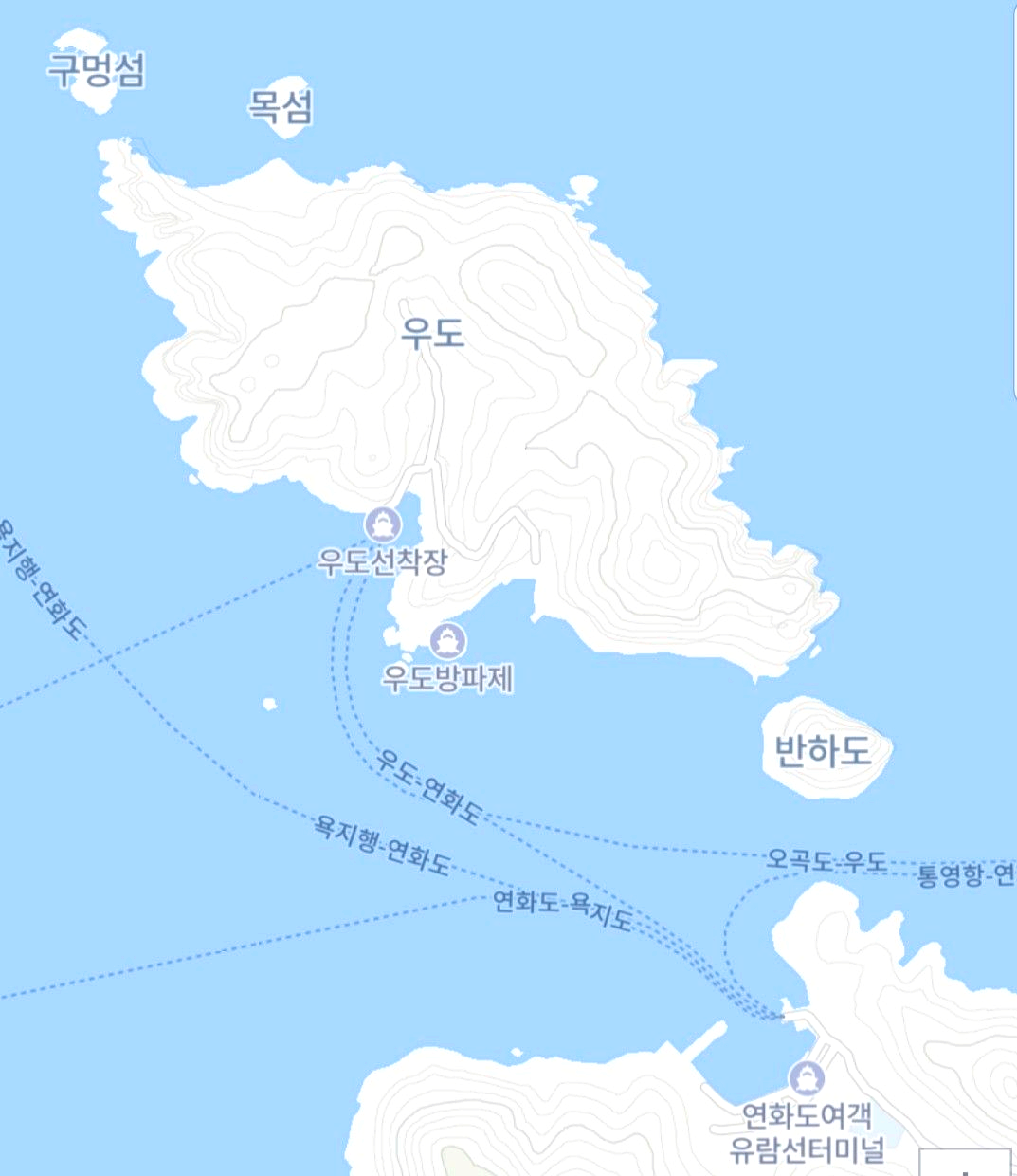 우도에도 선착장이 있었네요. 하지만 연화도 하선하시고 세 섬을 연결하는 보도교 통해 섬 트레킹 하시는 거 추천합니다.
