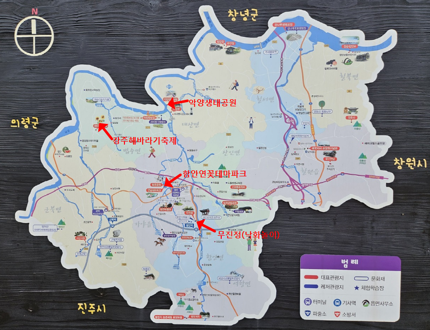 함안 연꽃테마파크 입구에서 볼 수 있는 함안 관광 안내지도인데요~ 대표적으로 함안에서 둘러봐야 할 곳은 4곳인 것 같습니다. 조금 서두르신다면 4곳을 모두 둘러볼 수도 있을 것 같네요~