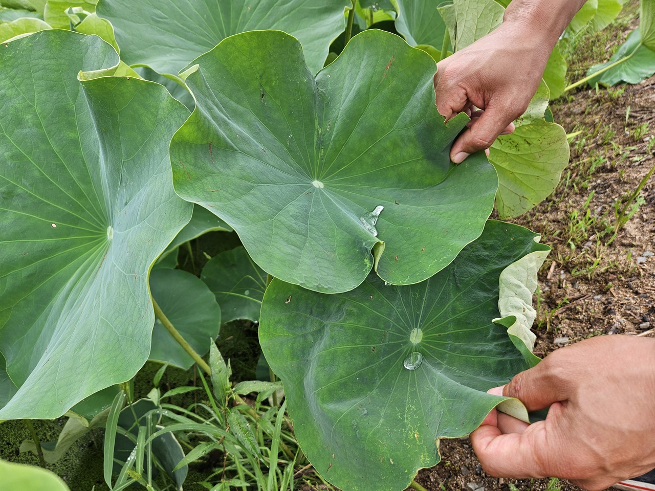 옆잎이나 옆밥에도 코팅이 되어 있는지 물이 응집력을 최대치로 가지고 있더라구요~ 한 방울 묻지 않고 굴러다니는 모습이 재밌기도 했답니다~