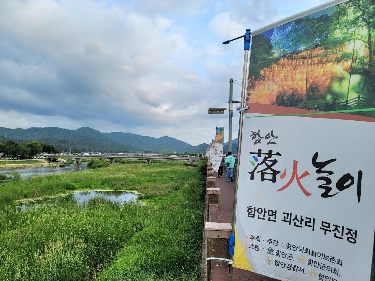 경남 무형문화재인 함안낙화놀이는 조선 선조 때부터 마을의 안녕과 풍년을 기원하며 시작되었다고 합니다. 일제강점기 중단되었다가 마을청년회에서 재연하여 지금까지 유지되고 있다고 합니다. 참나무 숯가루를 광목 심지와 함께 한지에 싸 새끼를 꼬은 것을 수면 위로 매달아 불을 붙이면 수많은 낙화의 장관을 보실 수 있답니다.