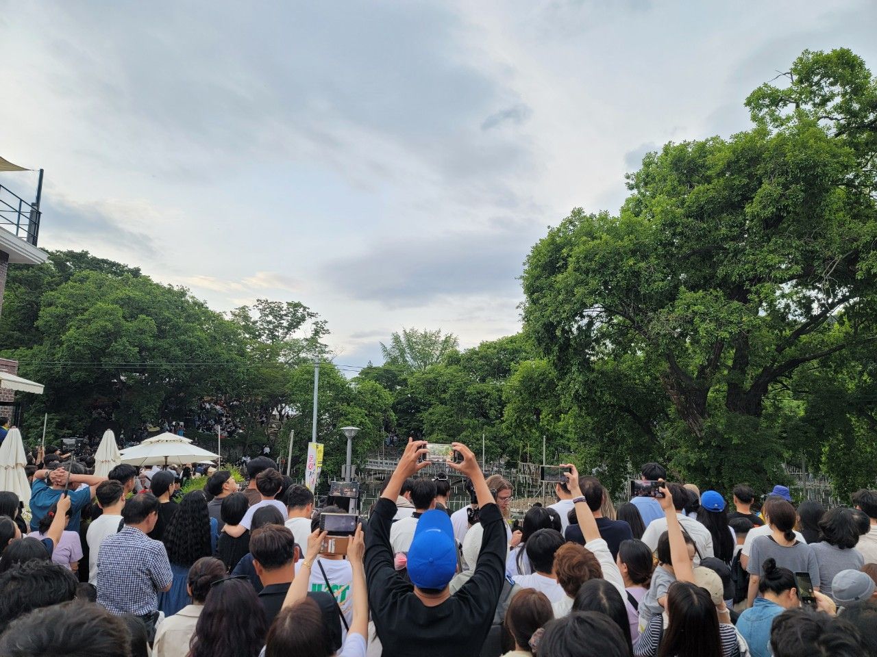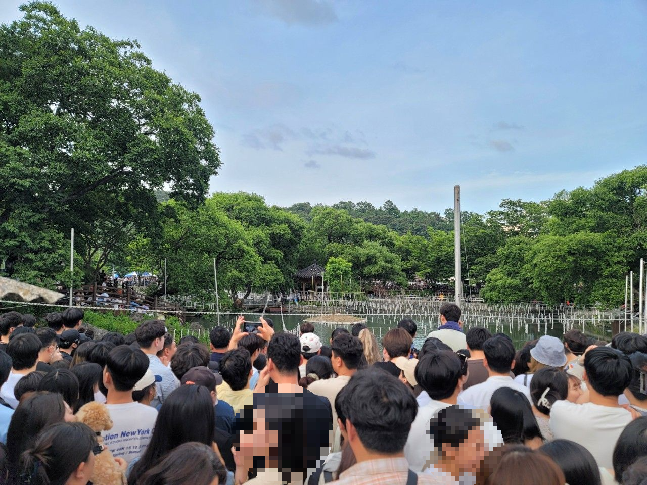 무진정 주변 모습입니다. 앞으로 보이는 사람들보다 주변에 더 많은 사람들이 있었습니다. 그래도 매달려 있는 낙화봉을 보니 낙화가 어떻게 떨어지는지 더 궁금해지고 직접 볼 수 있다는 기대감을 가지게 되더라고요.