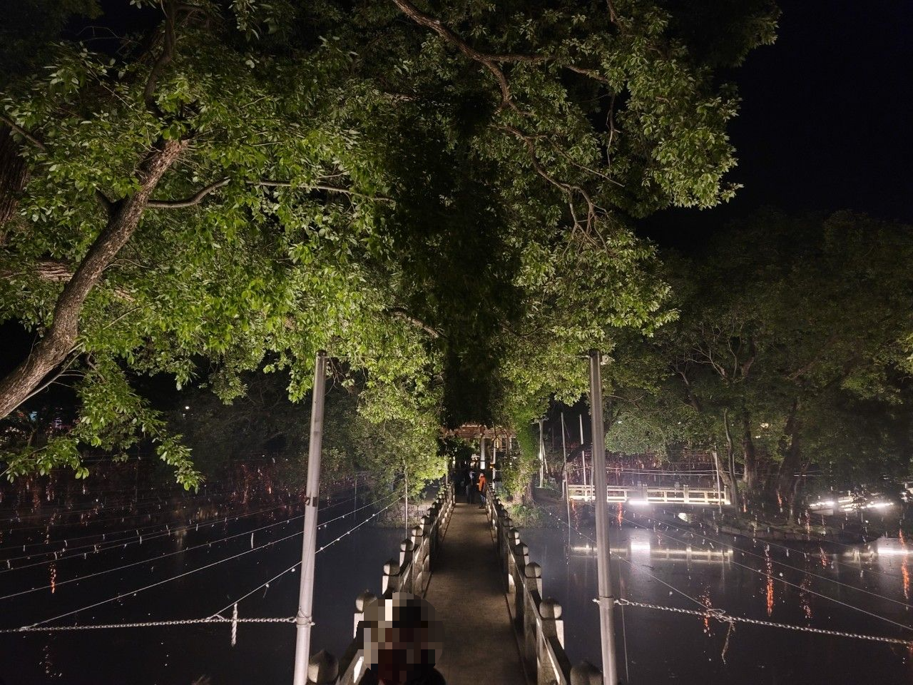 낙화축제가 마무리되고 무진정에 불이 켜졌습니다. 밝은 조명이 있으니 줄만 보이네요. 주변이 깜깜할 때 붉게 떨어지던 낙화의 모습이 잊혀지지 않을 것 같습니다.