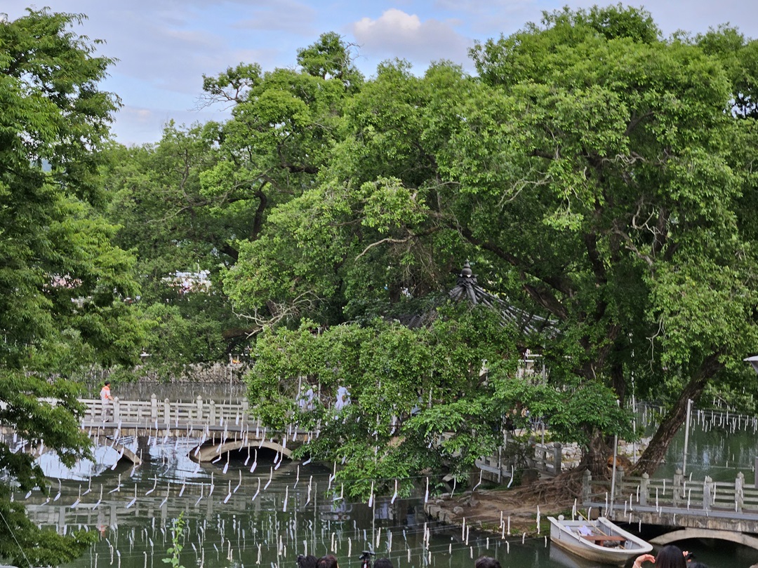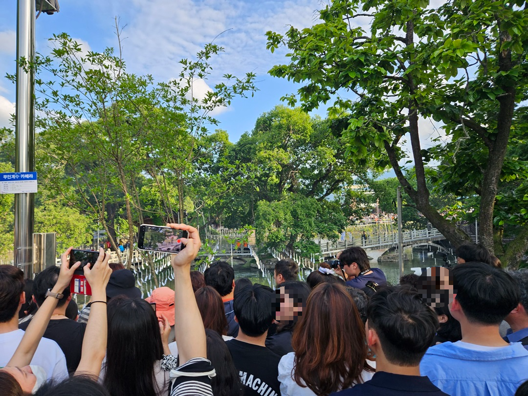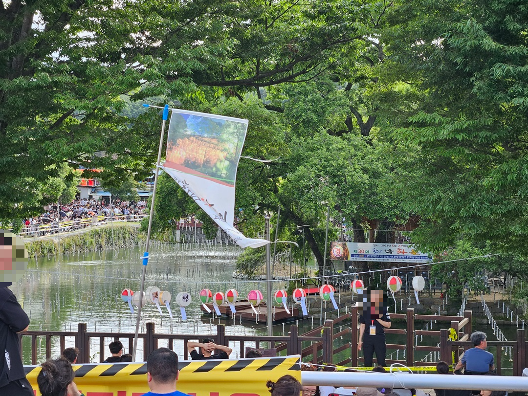 무진정 주변 모습입니다. 앞으로 보이는 사람들보다 주변에 더 많은 사람들이 있었습니다. 그래도 매달려 있는 낙화봉을 보니 낙화가 어떻게 떨어지는지 더 궁금해지고 직접 볼 수 있다는 기대감을 가지게 되더라고요.