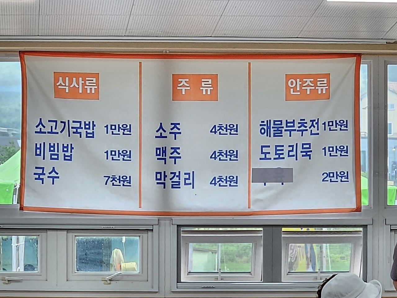시원하고 꽤 넓은 공간에 몇 가지 메뉴로 운영하고 계셨는데요~ 소고기국밥과 비빔밥 만원!! 국수가 7천원, 해물부추전과 도토리묵이 만원, 주류(소주, 맥주, 막걸리)가 4천원에 판매되고 있었답니다.~
