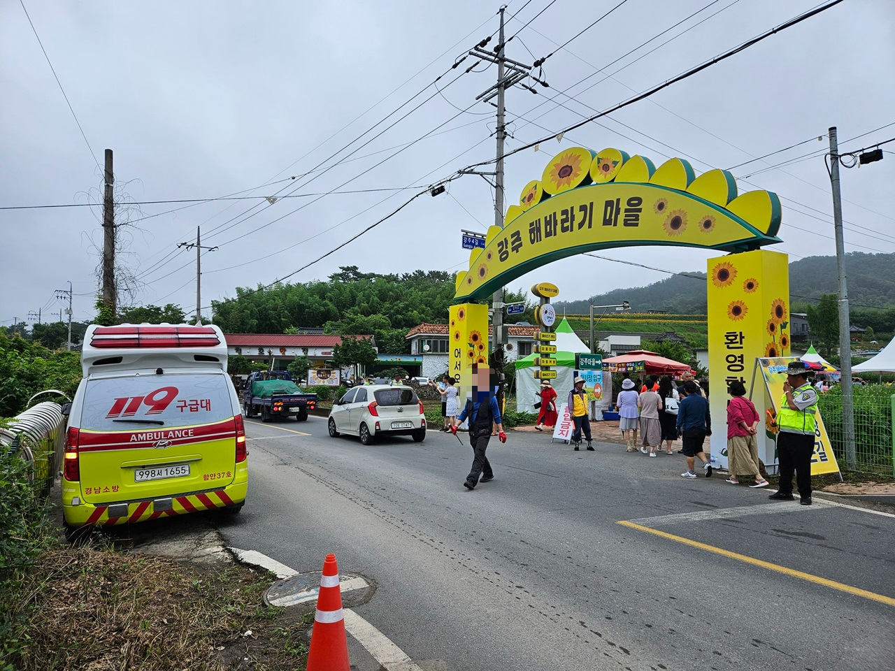 강주해바라기 마을 입구입니다~ 응급차도 대기하고 있었구요~ 축제관계자의 안내를 받고 길을 건너면 축제의 시작입니다~^^