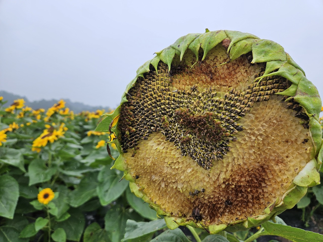 한 해바라기는 아주 컸는데요~ 씨앗을 사람들이 하나씩 빼가서 이제 몇 개 남지 않았더라구요~ 씨앗 뺀 빈 공간도 꽃처럼 보이는 해바라기입니다~
