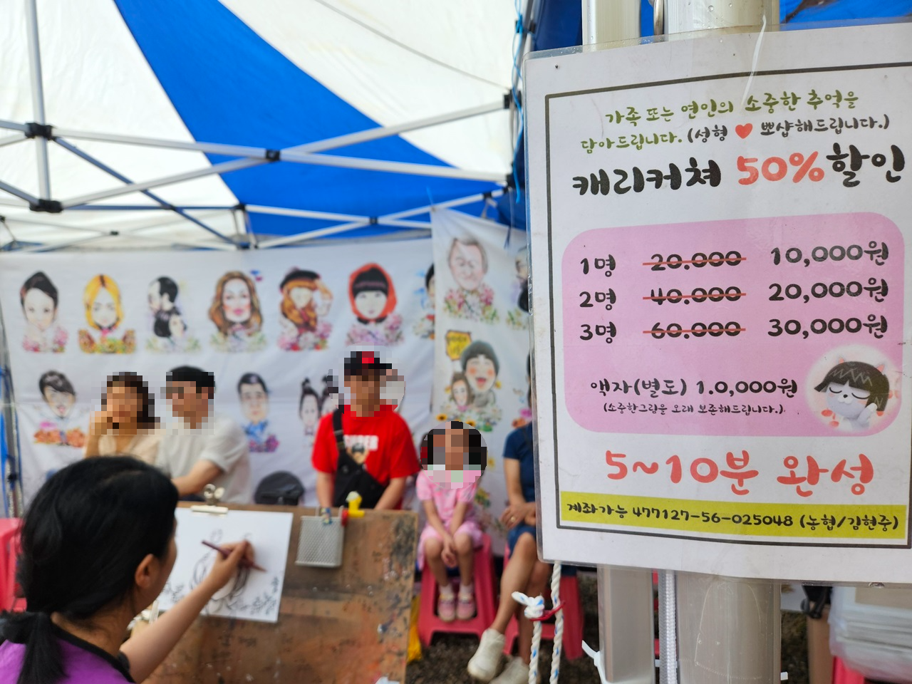 캐리커쳐를 그릴 수 있는 천막도 있었는데요~ 몇 분의 작가가 앉아서 그리고 있었는데 금방 뚝딱 그려내셔서 신기했답니다. 성형한 것처럼 캐리커쳐 그려주시는지ㅋㅋㅋ 성형뽀샵 캐리커쳐라는 문구도 재밌었답니다~