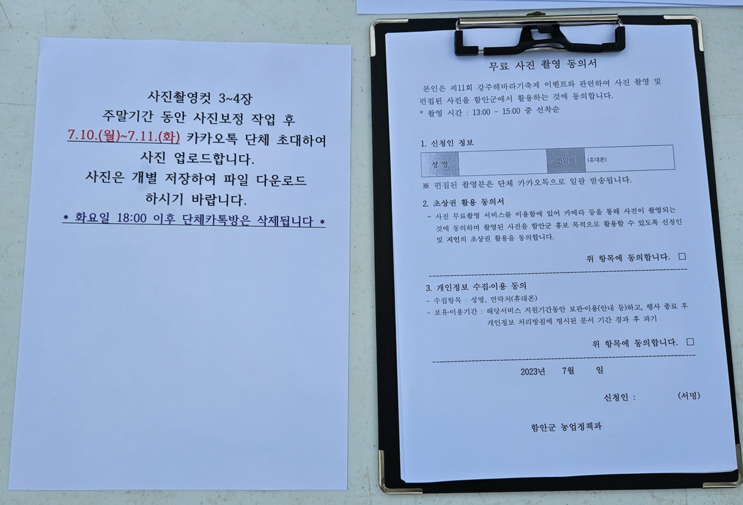 무료 사진 촬영 동의서부터 작성한 후 사진을 받을 수 있는 카카오톡 단체 채팅방에 대한 안내를 들은 후 곧바로 사진을 찍었답니다~ 주말 동안 찍은 사진을 보정 후 단체 채팅방에 한꺼번에 올리면 7월 10일~7월 11일(화)까지 공유하며 화요일 18시에 단체카톡방은 삭제된다고 하네요~