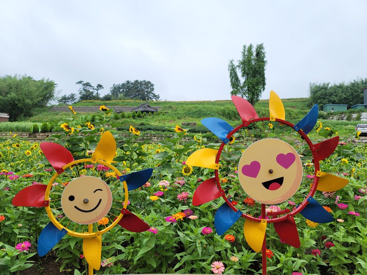 철로 만들어진 알록달록 해바라기도 아주 귀엽더라구요~ 표정이 살아있는 강주 해바라기 마을 마스코트~~