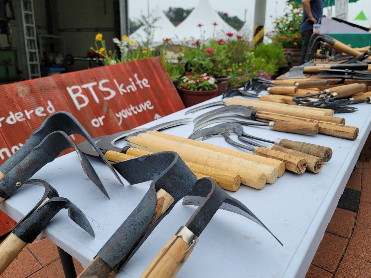 다양한 농사도구와 살짝 무시무시한 칼도 판매하고 계셨답니다. BTS  knife ?? 뭔가 궁금증이 생기는 이름이라 검색해 보니 '방탄스틸' BTS 강철을 사용한 것 같더라구요~ 마케팅 아이디어 좋은 사장님이시네요~