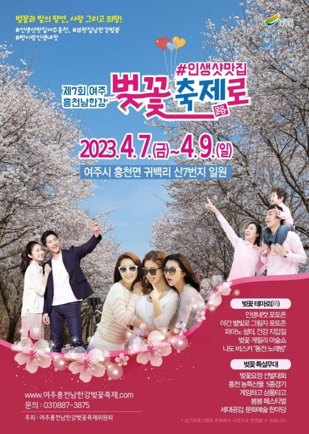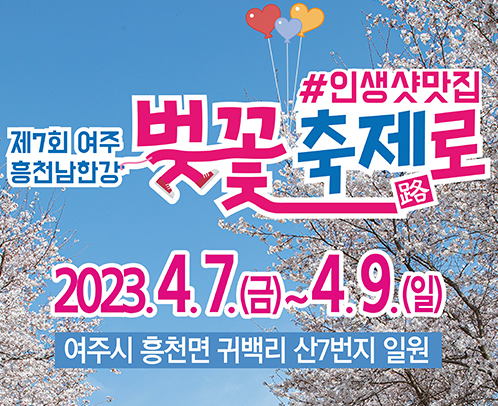 다양한 볼거리와 먹거리, 그리고 체험할 거리가 풍부한 제7회 여주흥천남한강벚꽃축제에 가셔서 행복한 추억 많이 만드시기를 바랍니다.