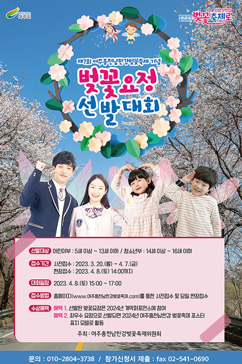 • 수상혜택 : 선발된 벚꽃요정은 2024년 개막퍼포먼스 참여 자격부여, 최우수 요정으로 선발 시 2024년 여주흥천남한강 벚꽃축제 포스터 표지모델로 활동