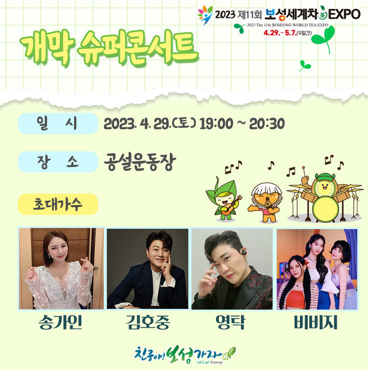 보성세계차엑스포 개막식 공연 출연진을 보니 대형 가수들로 구성되었습니다. 평소 송가인, 김호중, 영탁, 비비지, 유키스, 시그니처, TAN, 강예슬 팬이시라면 이번 공연 놓치지 말고 꼭 관람하시기 바랍니다.