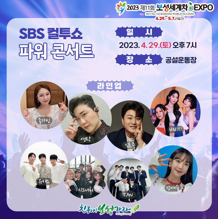 보성세계차엑스포 개막식 공연 출연진을 보니 대형 가수들로 구성되었습니다. 평소 송가인, 김호중, 영탁, 비비지, 유키스, 시그니처, TAN, 강예슬 팬이시라면 이번 공연 놓치지 말고 꼭 관람하시기 바랍니다.