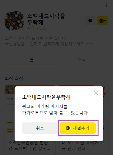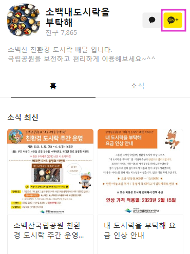 카카오톡에서 '소백내도시락을부탁해' 검색 후 채널추가 후 이용가능합니다.